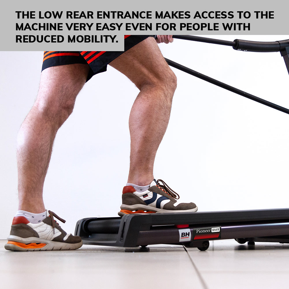 The Pioneer Senior is a treadmill specially designed for senior people who want to walk safely and comfortably at home. With the safety handlebars and easy access, even those with mobility problems will be able to exercise regularly at home. The treadmill comes with a LCD blue backlit screen, integrated speakers, and 12 preset programs to choose from. It has a manual tilt of 4%, and a running surface of 125x45cm. It's built-in wheels make it easy to transport and store at home.